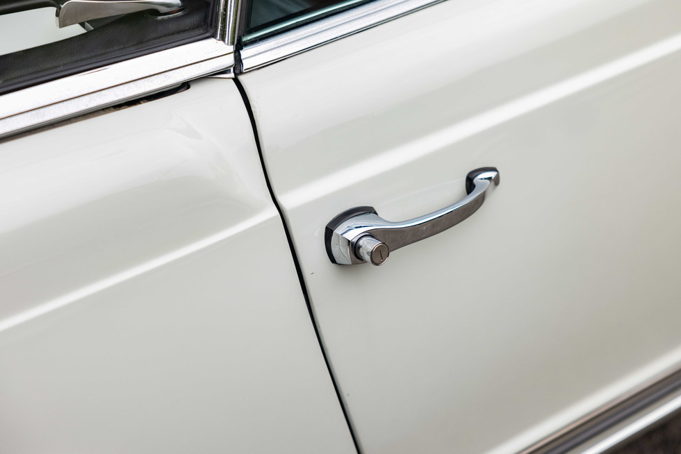 The Pagoda presents in good condition, the result of an older restoration that has been well‑kept and consistently maintained. The white paintwork shows well overall, with minor rust noted in the wheel‑well area—a common and addressable point on these cars. The chrome exterior trim is in acceptable condition, displaying some tarnish consistent with age. More notably, rust is visible on the rear left chrome bumper, which will require professional remediation. The black soft‑top is fully functional, and the body‑coloured hardtop (including a standing rack) accompanies the sale. The car rides on its original wheel caps fitted with regular tyres accented by white‑wall “stick‑on” trim.