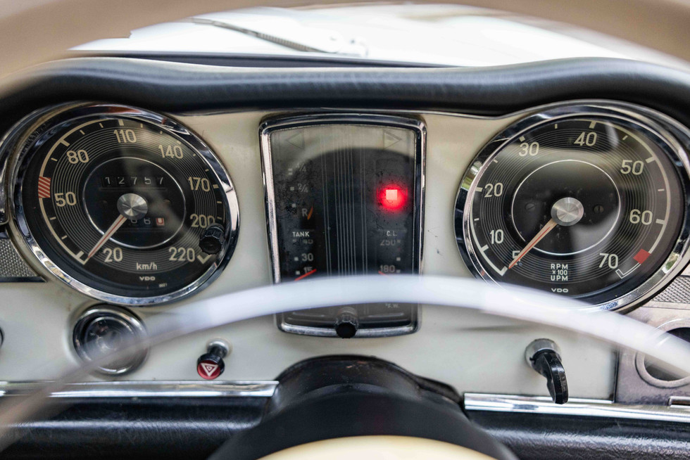 This beautifully preserved 280SL Pagoda comes with a thick file of invoices dating back to 2008, documenting a no‑expense‑spared approach to restoration and maintenance. The car has been cherished by its previous owner, who invested heavily in mechanical, body, and interior work. The odometer readings confirm exceptionally low and careful use – from 3,682 in 2012 to just 11,841 in 2021, averaging less than 1,000 km per year. This is a true collector’s example that has been meticulously sorted.