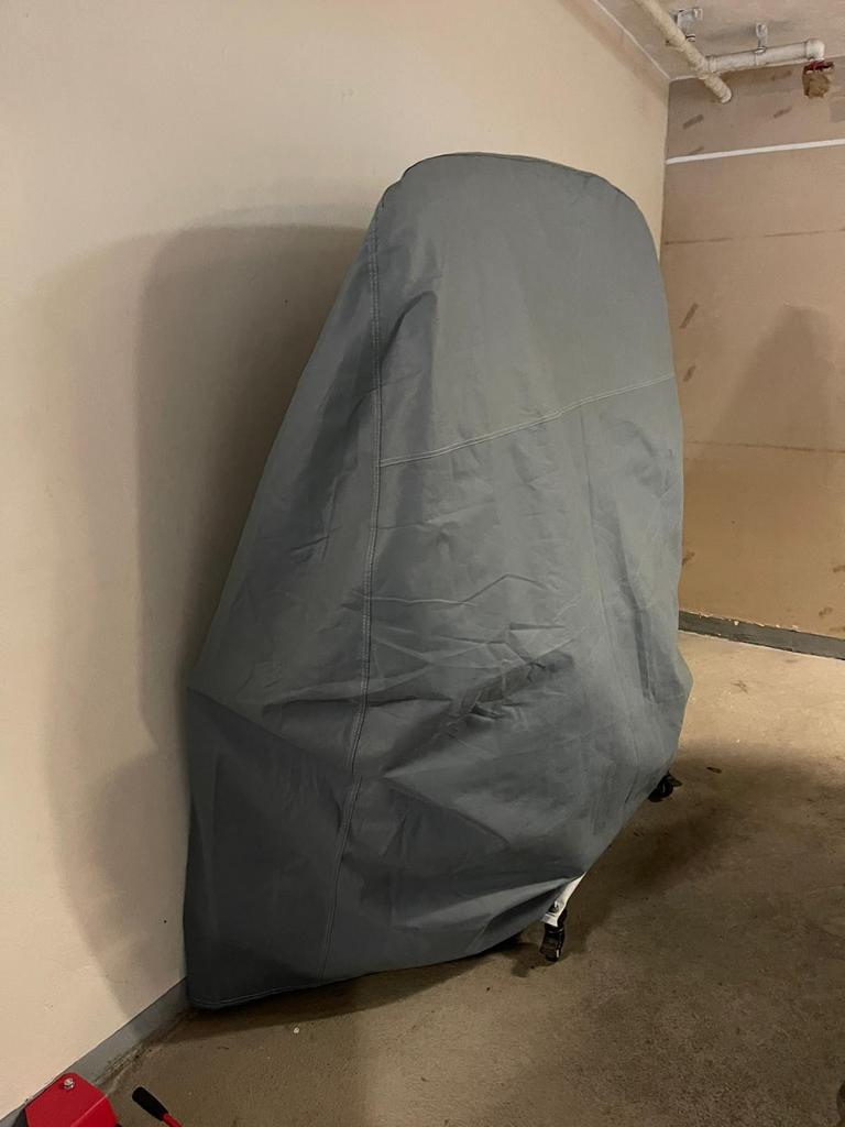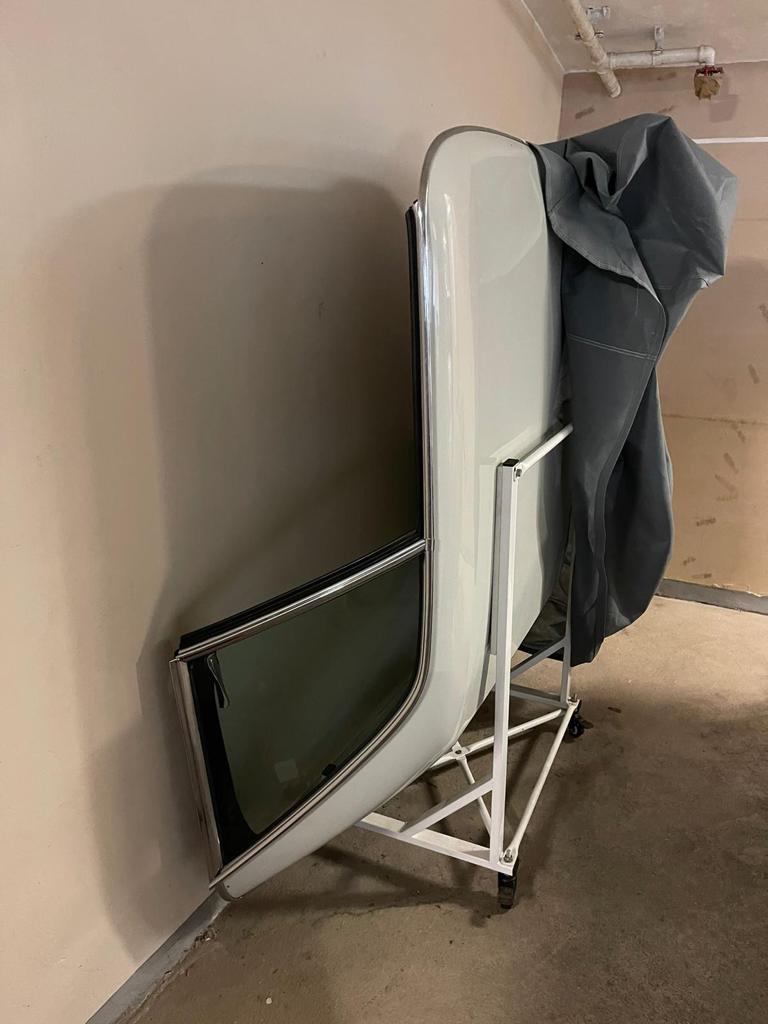 Exterior (77/100): Older restoration, well‑kept. Good paint overall, but minor rust on wheel‑well area. Chrome shows some tarnish, with rust on the rear left chrome bumper requiring attention. Soft‑top functional. White hardtop and stand included.