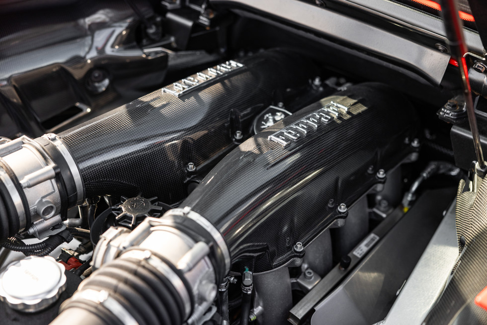 Track-Focused Specification: F1-Superfast2 transmission, carbon-ceramic brakes, Tri-colore racing livery, Alcantara-clad dash, and lightweight carbon fiber body enhancements.