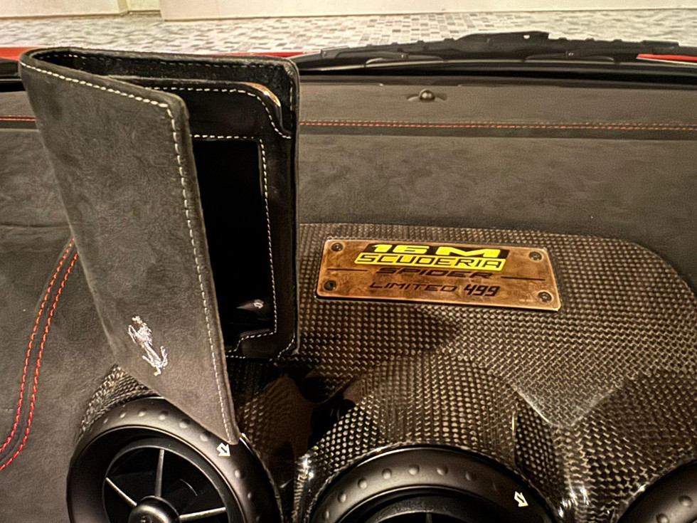 This 16M Spider has resided in Hong Kong since its delivery, cherished by its sole owner as a climate controlled garage-kept masterpiece. The Rosso Scuderia paintwork, accented by the iconic Tri-colore stripe, gleams with showroom freshness, while the Black Alcantara interior—stitched in Rosso contrast thread—shows zero signs of wear, a testament to its sheltered life.